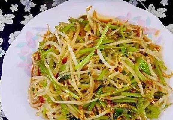 用料:綠豆芽300克,芹菜2棵,五花肉50克,花生油3勺,蔥1段,薑1小塊,蒜2瓣,幹辣椒2個,黃豆醬2勺,鹽少半勺
