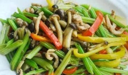 食材:芹菜,香菇,熏幹,彩椒,鹽。