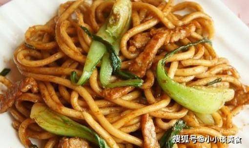 4、鍋內留適量精油,將蔬菜炒軟,下面條和肉末,加糖、鹽、醬油、老抽用筷子炒勻。相同。