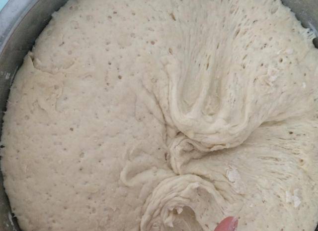 第二步:然後倒入適量的面粉和糖,攪拌成面團,揉成光滑的面團,蓋上蓋子放在溫暖的地方發酵至兩倍大。