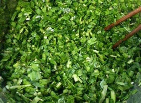 3、鹽要等餃子包好,韭菜切塊蘸油,剛開始不要出水。