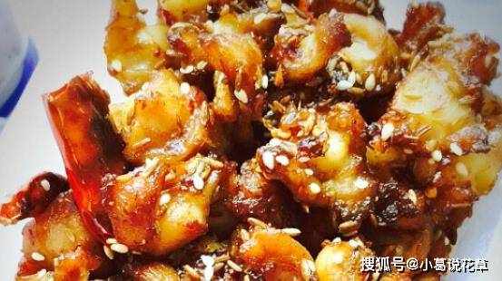 2、放入鍋中翻炒至湯汁收幹,根據顏色加入適量醬油,稍煮片刻,撒上孜然粉和白芝麻。
