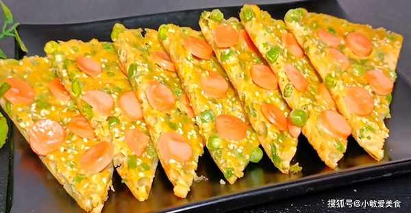 6、時間到,餅子的表面色澤金黃,利用一個盤子取出來放在菜板上面,切成自己喜歡的形狀,就可以開吃瞭。