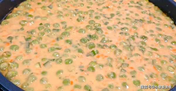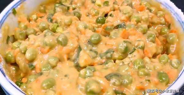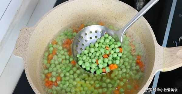 4、鍋中倒入清水,放入鹽,增加食材的底味,少許的食用油,緩解蔬菜的營養流失過快,下入豌豆仁,胡蘿卜丁,開鍋煮制一分鐘,控水撈出,過一下涼水,控水撈出備用。