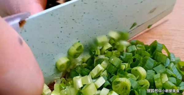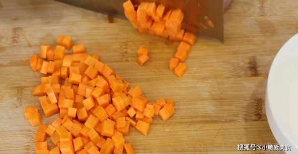2、準備一個去皮的胡蘿卜,切成小碎丁,再準備一把小蔥,切成蔥花,蔥花盡量切碎一點,這樣口感吃起來更好。