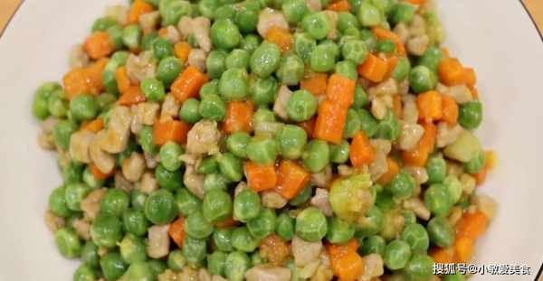 5、鍋中加入少許的食用油。下入醃制好的肉丁炒熟,下入蔥花和薑末炒香。蔥花和薑末炒香以後,下入豌豆仁和胡蘿卜丁,翻炒均勻,下入鹽,增加底味,下入雞粉增加鮮味,把所有調料快速的和鍋中的食材翻炒均勻。最後勾入少許的水淀粉等鍋中的芡汁完全糊化以後即可出鍋裝盤,一道非常美味的豌豆炒肉丁就制作完成。