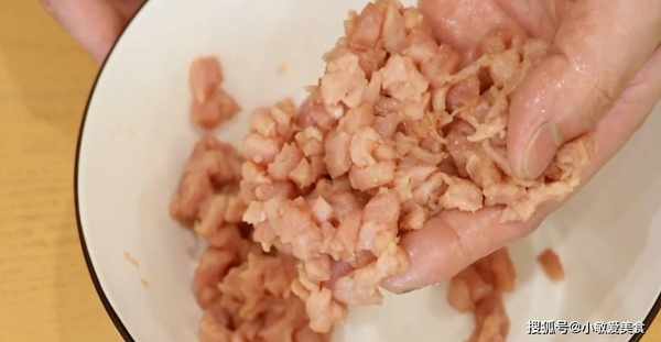 3、裡脊肉一塊,切成肉丁,肉丁的大小和胡蘿卜丁差不多就可以。肉丁放入碗中,下入料酒。下入生抽、醬油,鹽,胡椒粉,用手朝著一個方向不停的把肉丁抓拌,給肉上勁。