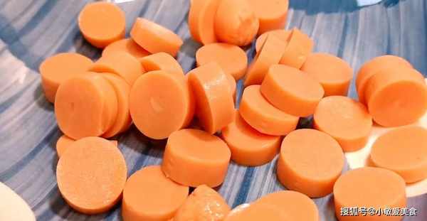 3、準備兩個火腿腸,切成小圈,切完也裝入盤中備用。