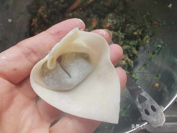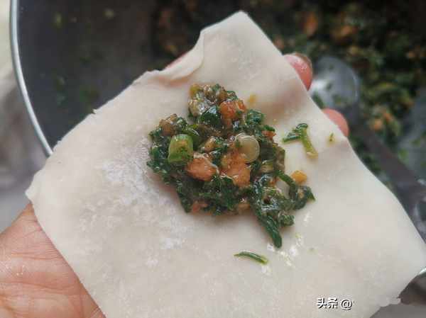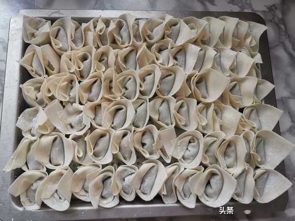 第五步:對折以後,就是餛飩。當然餛飩的包法很多,隨意就好,沒有很正規的包法。