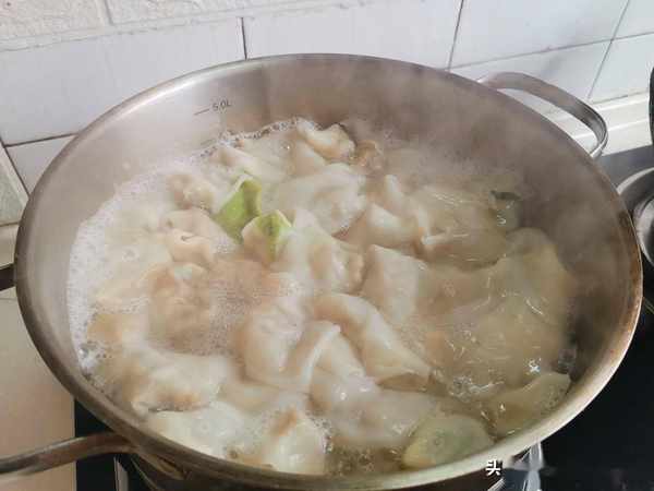 第八步:鍋裡放入清水燒開,煮上餛飩,用勺子輕輕推動,蓋上蓋子煮開,餛飩熟透。