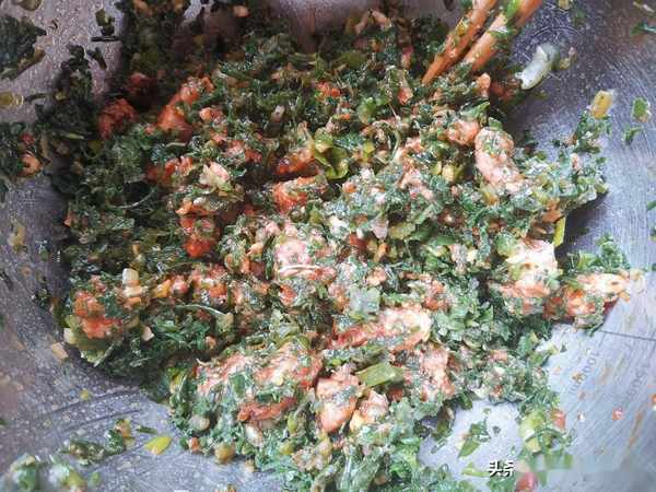 第二步:肉餡放入蔥末,薑末,生抽,鹽,花生油拌勻,在放入焯水剁碎的薺菜攪拌均勻,餛飩餡就做好瞭。