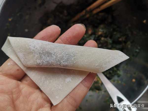 第三步:餛飩皮用買來的就行,有時候我也會自己搟一些餛飩皮用。