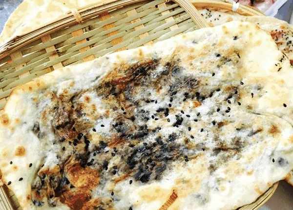 剁細的梅幹菜和晶瑩的肥膘肉混合成餡,包制在面團裡搟成薄薄的面餅,刷上一層油往冒著火光的爐口一送,貼著壁爐的面餅慢慢被烤成的酥脆梅幹菜肉餅。