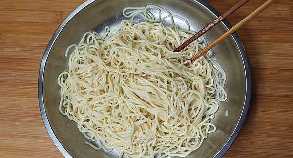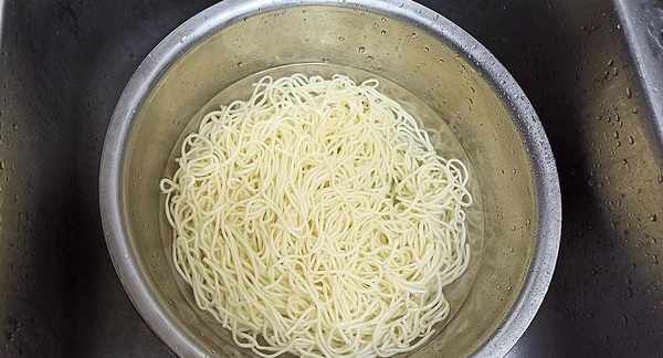 (4)面撈出後要用涼水泡涼,撈出來拌上植物油,這是面條不粘連、粘鍋的關鍵。