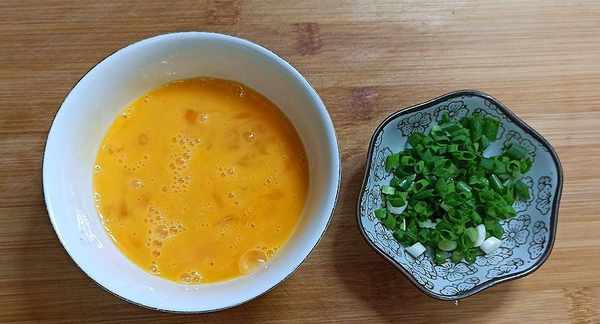 【步驟二】:把雞蛋打入碗中,用筷子攪散,香蔥切成末裝盤備用。