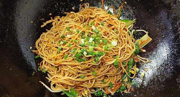 制作炒面非常簡單,可以放點肉絲、一把豆芽、幾棵青菜或者再放一點火腿腸還有雞蛋,丟進鍋裡,再放入煮熟的面條,幾勺調料下去,翻炒均勻,香味便撲鼻而來,口水就流瞭下來。