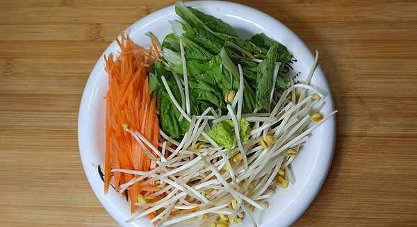 【步驟一】:胡蘿卜切成絲、豆芽把根掐掉清洗幹凈、上海青摘洗幹凈,分別裝盤。