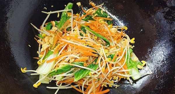 【步驟七】:重新起鍋放油燒熱,放入上海青、胡蘿卜絲、豆芽,大火翻炒至斷生。
