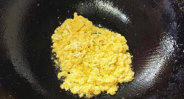 【步驟六】:鍋中放入一勺油燒熱,把雞蛋液倒入鍋中炒熟,先盛出來備用。