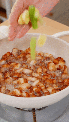 往鍋裡加上蔥段、薑片,去腥提味,它倆是最簡單的搭配。