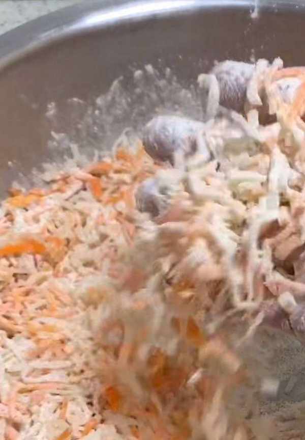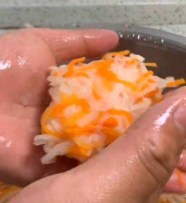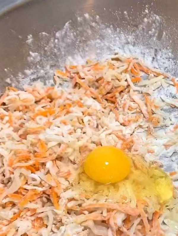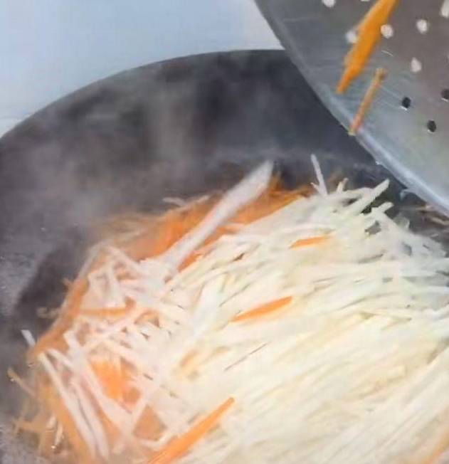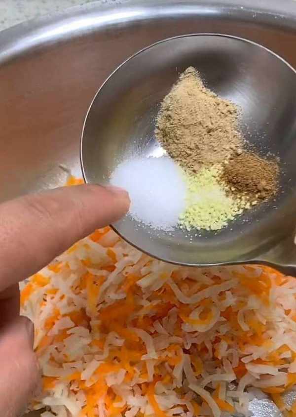 開鍋之後撈出白蘿卜和胡蘿卜用涼水投涼,投涼之後把蘿卜裡面的水份攥幹凈。攥越幹越好,如果你攥的不幹裡面水份比較多的話等一會你就得多放很多面,面放得多的話裡面炸完之後就粘粘糊糊的就不好吃瞭。
