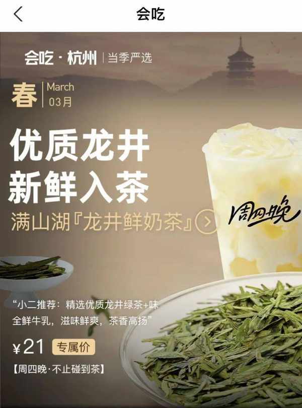 為更好地滿足消費者對龍井新品美食的需求,今年開茶季期間,餓瞭麼在“會吃”頻道同步上線瞭當季嚴選的龍井美食活動,用戶搜索“西湖龍井開茶節”即可嘗鮮相關趨勢新品,包括龍井珍珠奶茶、龍井奶凍、龍井紅豆面包、龍井茶酥等。