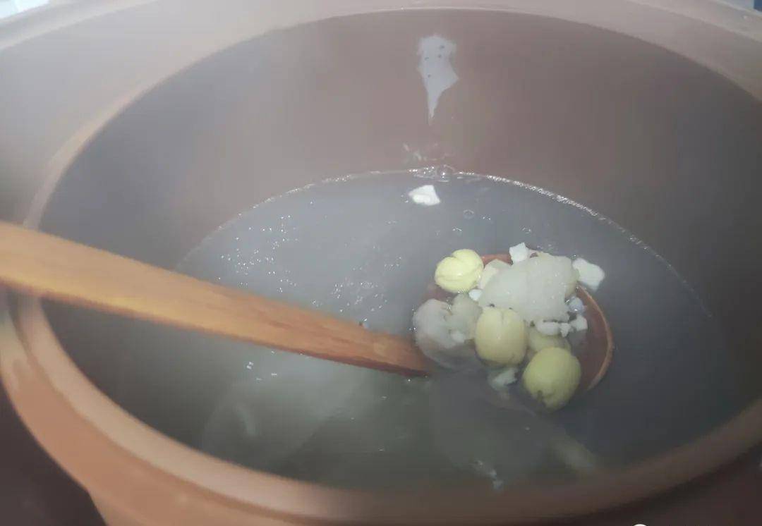 3.水的量跟平時燉湯一樣不要太多,緊接著蓋上蓋子放著燉煮2小時。鍋中的湯汁燉好後,打開鍋就可以聞到一股香清甜的氣質。特別的好聞。然後我們加入適量的食鹽,用勺子給它攪拌均勻,嘗試一下氣質,可以的話我們就關火出鍋瞭。