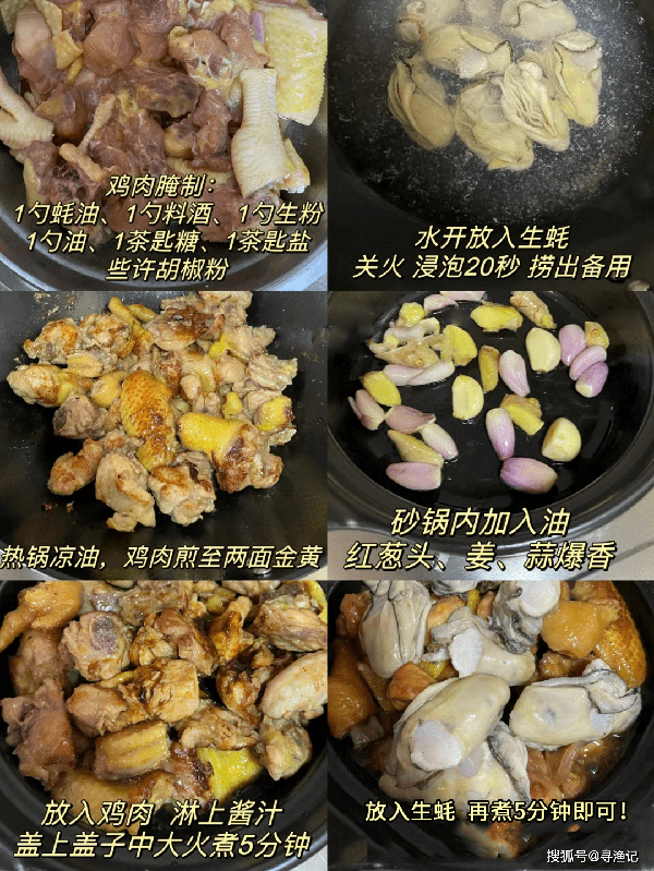 5. 砂鍋內加入油、紅蔥頭、薑、蒜爆香。放入雞肉,淋上醬汁,蓋上蓋子後用中大火煮幾分鐘,放入生蠔,再煮最多5分鐘就可以撒上蔥段和辣椒開吃瞭!