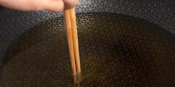 9.起鍋倒油,燒到鍋底開始冒泡就可以瞭。或者拿一根筷子,紮進油鍋裡面筷子四周開始冒密集的泡泡就可以瞭。