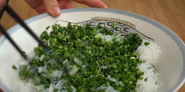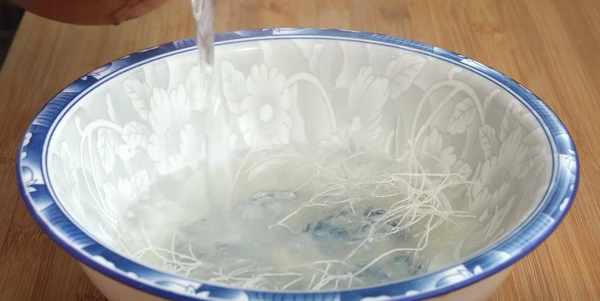 4.粉絲泡發之後剪成小段,跟韭菜混合,調入食用油,翻拌均勻備用。