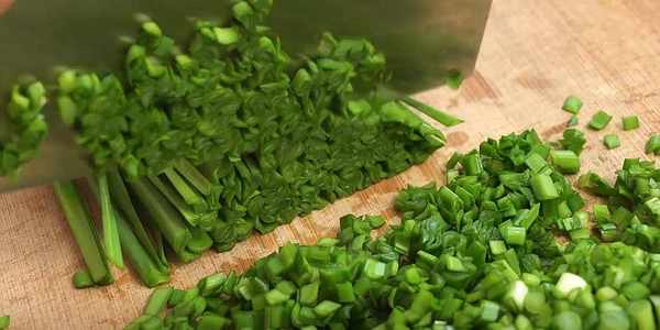 2.準備一把韭菜,擇洗幹凈,用刀切成小碎丁。