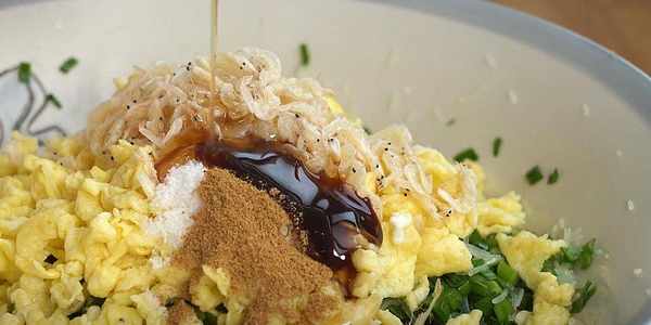 5.接著加入雞蛋碎,一把蝦皮,調入鹽跟花椒粉,適量胡椒粉,適量蠔油,少許香油翻拌均勻即可。