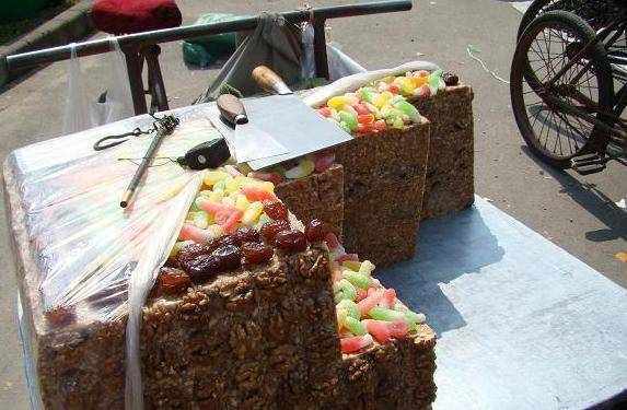 除瞭報價方面,還有另外一個坑也讓所有的遊客對切糕印象深刻,那就是哪怕是在明碼標價的情況下,遊客也會買到比自己的預算高出很多的切糕,通常切糕商傢會告訴遊客,切糕都是一整條的,切下來之後就不方便出售給其他顧客瞭。