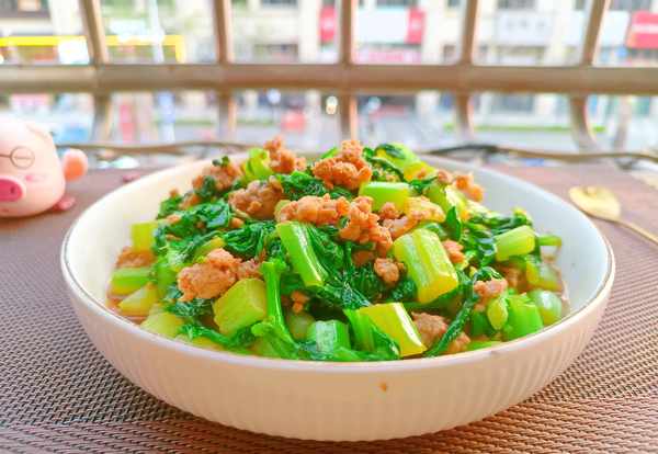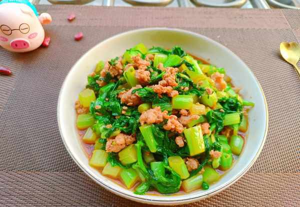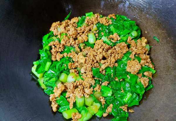 ③等菜苔的顏色炒成深綠色的時候倒入肉末,繼續開大火炒。