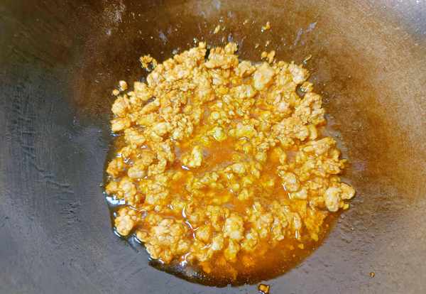 ①我們把瘦肉洗幹凈,剁成肉末。加入一點淀粉、生抽、食用油順時針攪拌一會兒。鍋中滑油,再倒入肉末煸炒。等肉末顏色變白一點後,再加點生抽提鮮上色,翻炒一會兒。