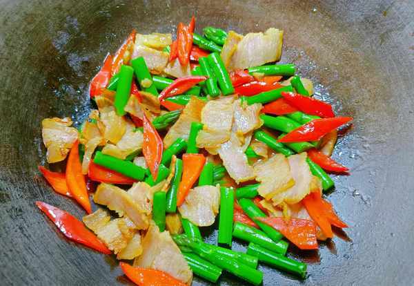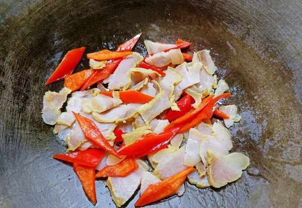 ③鍋中滑油,倒入臘肉炒。等煸炒出臘肉上面的油脂後就可以瞭。辣椒洗幹凈,切成小塊,倒入鍋中一起炒。