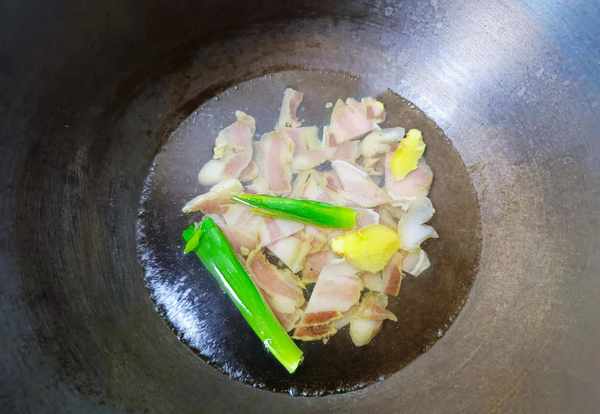 ①我們把臘肉用淘米水搓洗一下,切成薄片,放入鍋裡面。倒點料酒、蔥、薑去腥,開大火煮。等臘肉變色後撈出來,用溫水沖洗一下,再瀝幹水分。