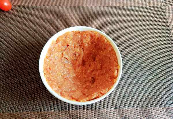 ②加入鹽、生抽、淀粉、蔥薑水、食用油順時針攪拌一會兒,然後把它按壓在碗中。
