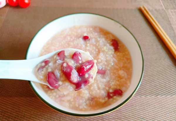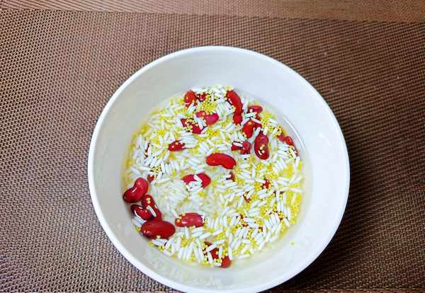 ①我們把小米、糯米、紅腰豆泡入水中40分鐘,搓洗幹凈。倒入鍋中,加水沒過食材,開始煮粥。