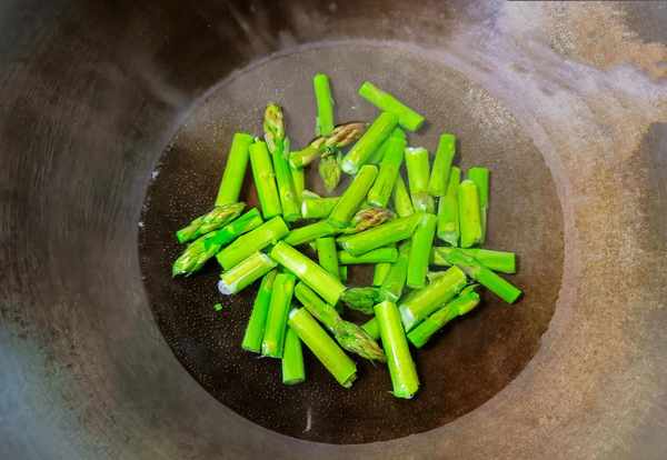 ⑤用鏟子按壓一下蘆筍,能按壓下去時加一點點鹽調味,大火爆炒幾下就可以食用瞭。