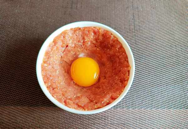 ③取出雞蛋打入碗中,再加一小勺的開水,這樣雞蛋和肉不會粘連在一起。