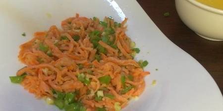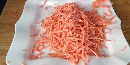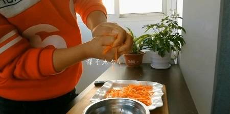 1、將胡蘿卜去皮洗幹凈,有擦刀的擦成絲,沒有的就受累下,動手切成絲備用。