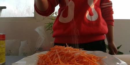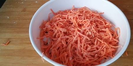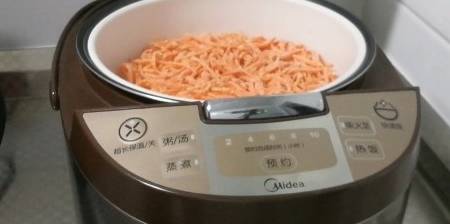 3、5分鐘後,用手攥幹胡蘿卜絲中的水分,放到一個大點的容器裡備用。