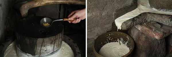 泡好的黃豆,用傳統石磨磨漿,濾盡豆渣後用大火熬制,點鹵攪拌制成豆腐。