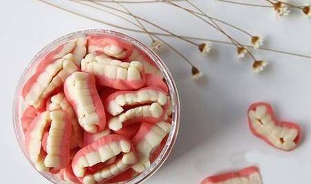 第一種假牙糖,這是一種外形酷似假牙的軟糖。一般愛吃軟糖的朋友都知道,軟糖都會做成一種非常可愛的形狀,像卡通人物,小貓小狗之類的,都是非常可愛的樣子。但是這一份假牙糖卻不一樣,雖然它的味道是草莓牛奶的味,但是做成這種模樣,惡趣味倒是更多一些,吃的時候可能心理感受很奇妙。好在這份糖上面的牙齒是硬的,不然這個口感真是不敢想!