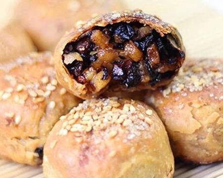 第二個要說的是一種梅菜餡兒的酥餅,梅菜扣肉這份菜一直是非常受人的喜愛的,燉煮過後的梅菜完美的將扣肉的油分給吸收掉瞭,吃起來非常的香。肉也是吃著肥而不膩,又軟又香,簡直就是下飯神菜。但是當梅菜扣肉和蘇炳結合起來,那可不是1+1大於2的效果,連等於都沒有。這個味道口感真的是非常怪,本身就足夠油膩的酥餅,再配上梅菜扣肉,真的是膩到爆炸瞭。