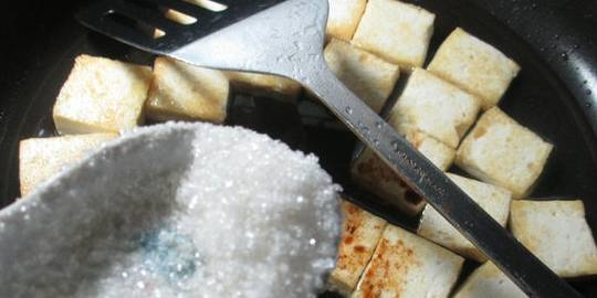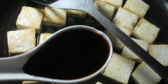 北豆腐300克、大蔥95克、花生油4湯勺、生抽1湯勺、白糖少許、精鹽0.5勺