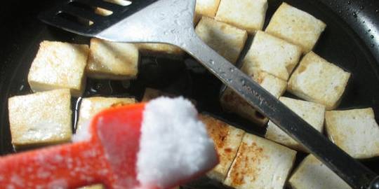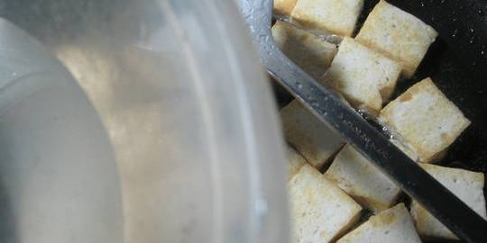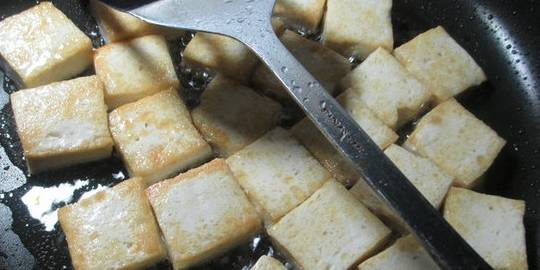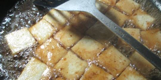 2.取平底鍋置火上加4湯勺油燒熱,下入切好的老豆腐兩面煎一下。