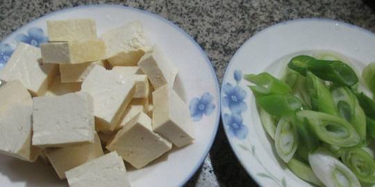 1.食材:老豆腐(已切開)、大蔥(已清洗切開)