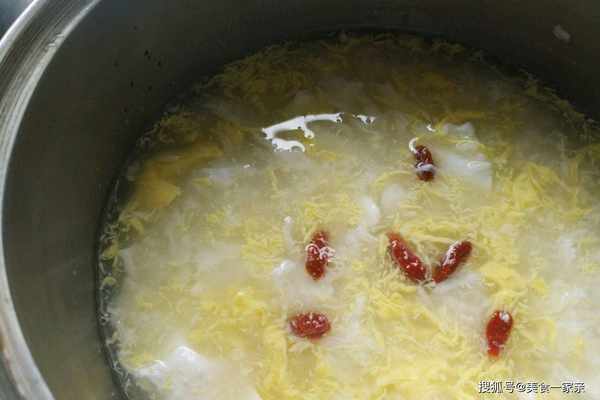 第3步:雞蛋倒入鍋中之後,不要馬上攪動,應該等它加熱十秒鐘左右再用筷子開始攪動。雞蛋倒入鍋中的時候要開大火,這樣雞蛋才能夠加入的更加快速加熱,形成蛋花的幾率更加高。雞蛋放入鍋中煮兩分鐘之後就在鍋中加入枸杞,枸杞不用太多,基本上幾粒就可以瞭。放入枸杞再煮兩分鐘就可以直接出鍋,一道好吃又好聞的雞蛋沖甜酒就出來瞭。